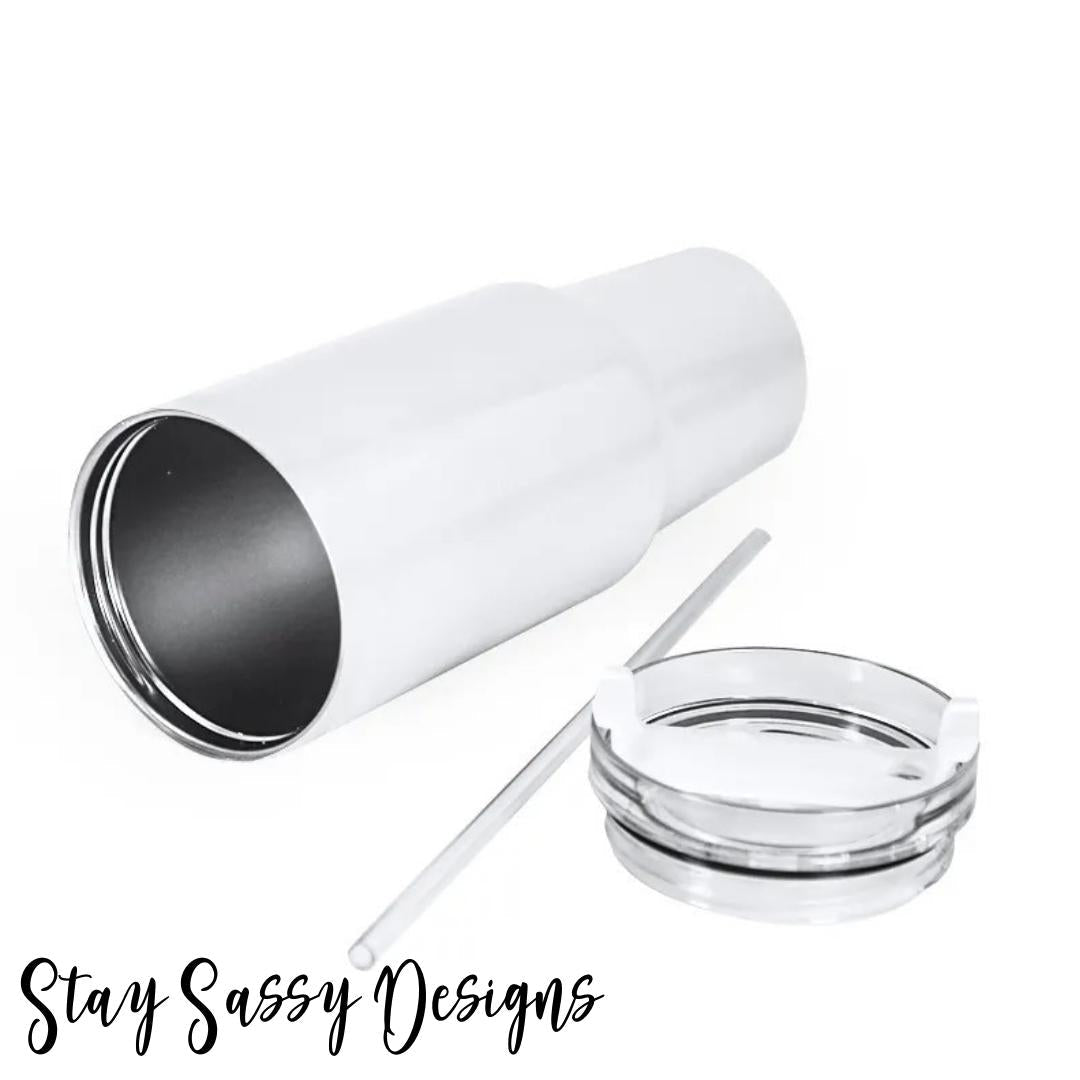 These tumblers have a white glossy finish and a silver ring around the top. Handles do not come attached. You will receive in the box Tumbler, Lid, Handle (with 2 screws packed inside, Careful don't throw these away!), and Hard Plastic Straw.