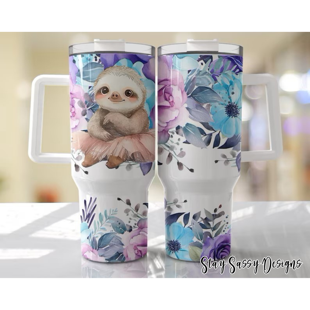 40 oz. Purple Floral Sloth Tumbler w/Handle