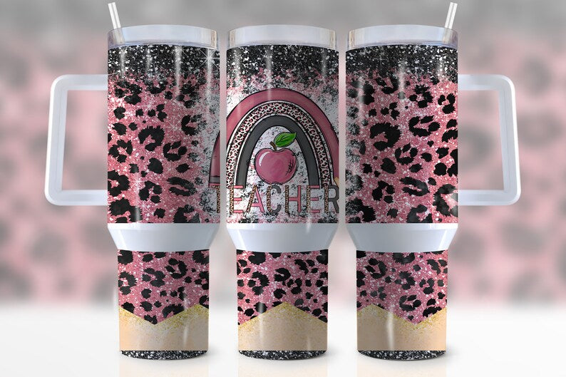 40 oz. Rainbow Teacher Leopard Tumbler w/Handle