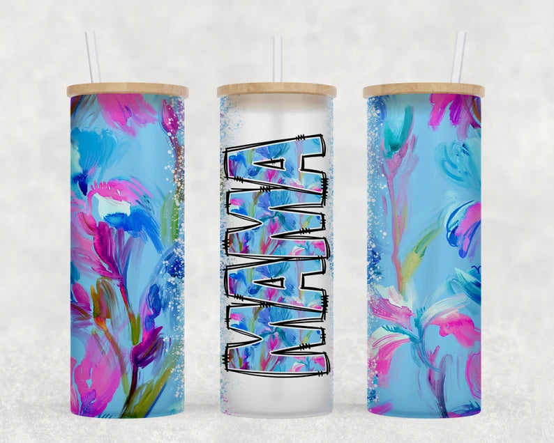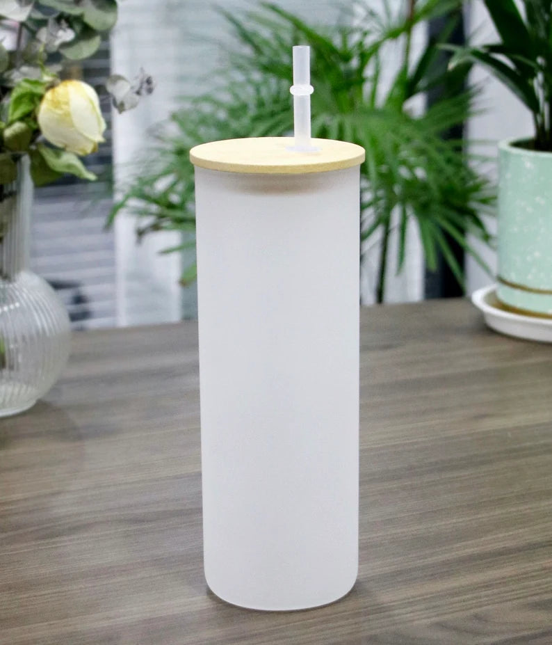 These beauties are glass tumblers that come with a bamboo lid and plastic straw. They are great for summertime! They come in 25 oz.