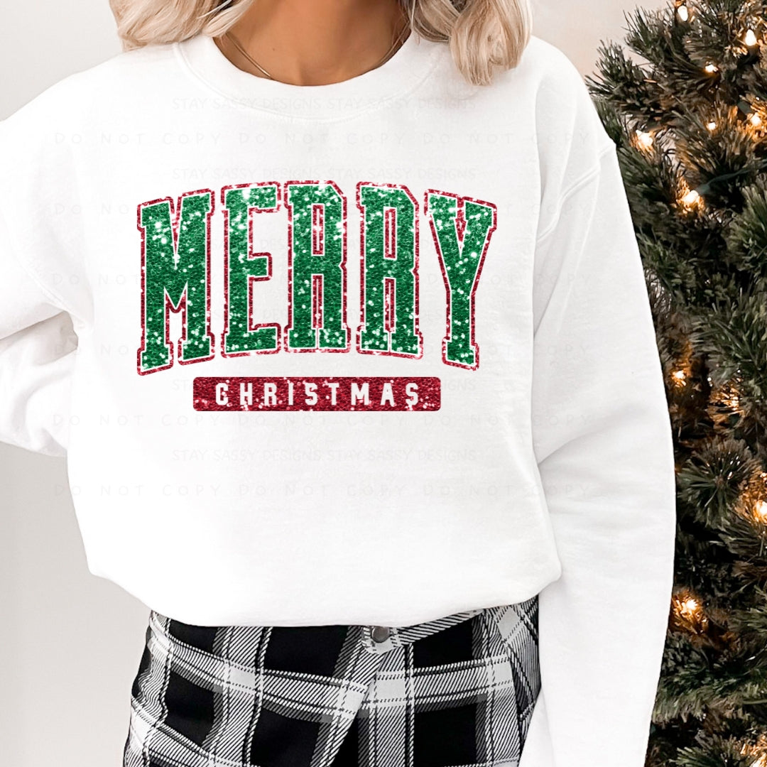 Green & Red Merry Christmas Faux Glitter (Multiple Shirt Styles)