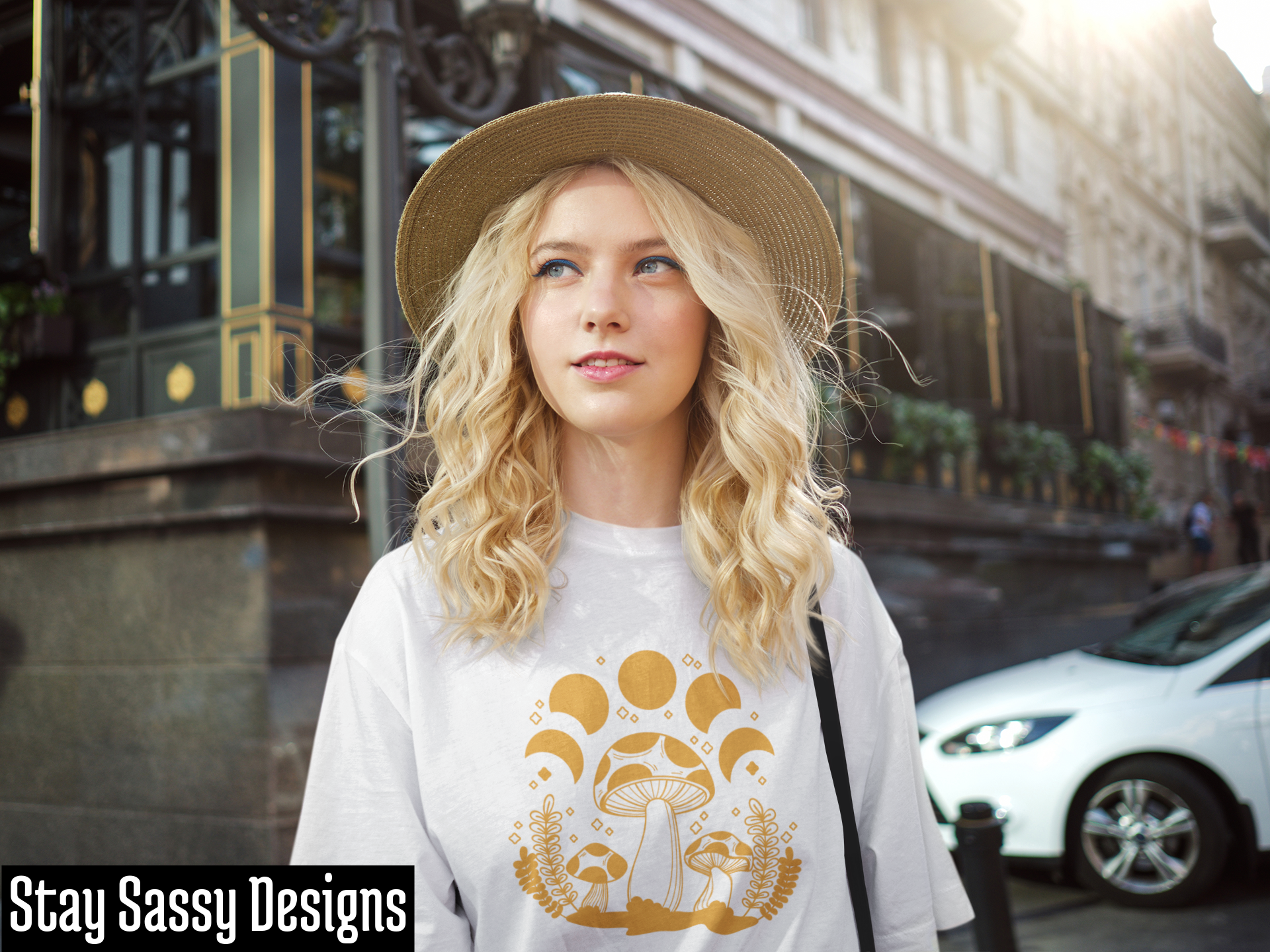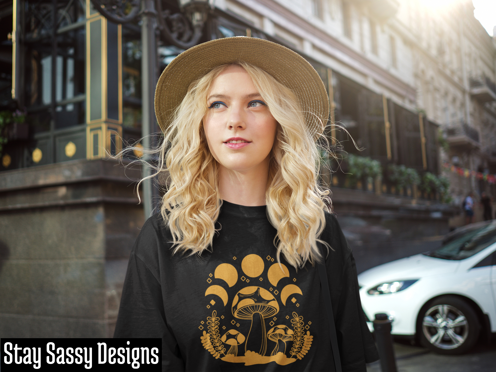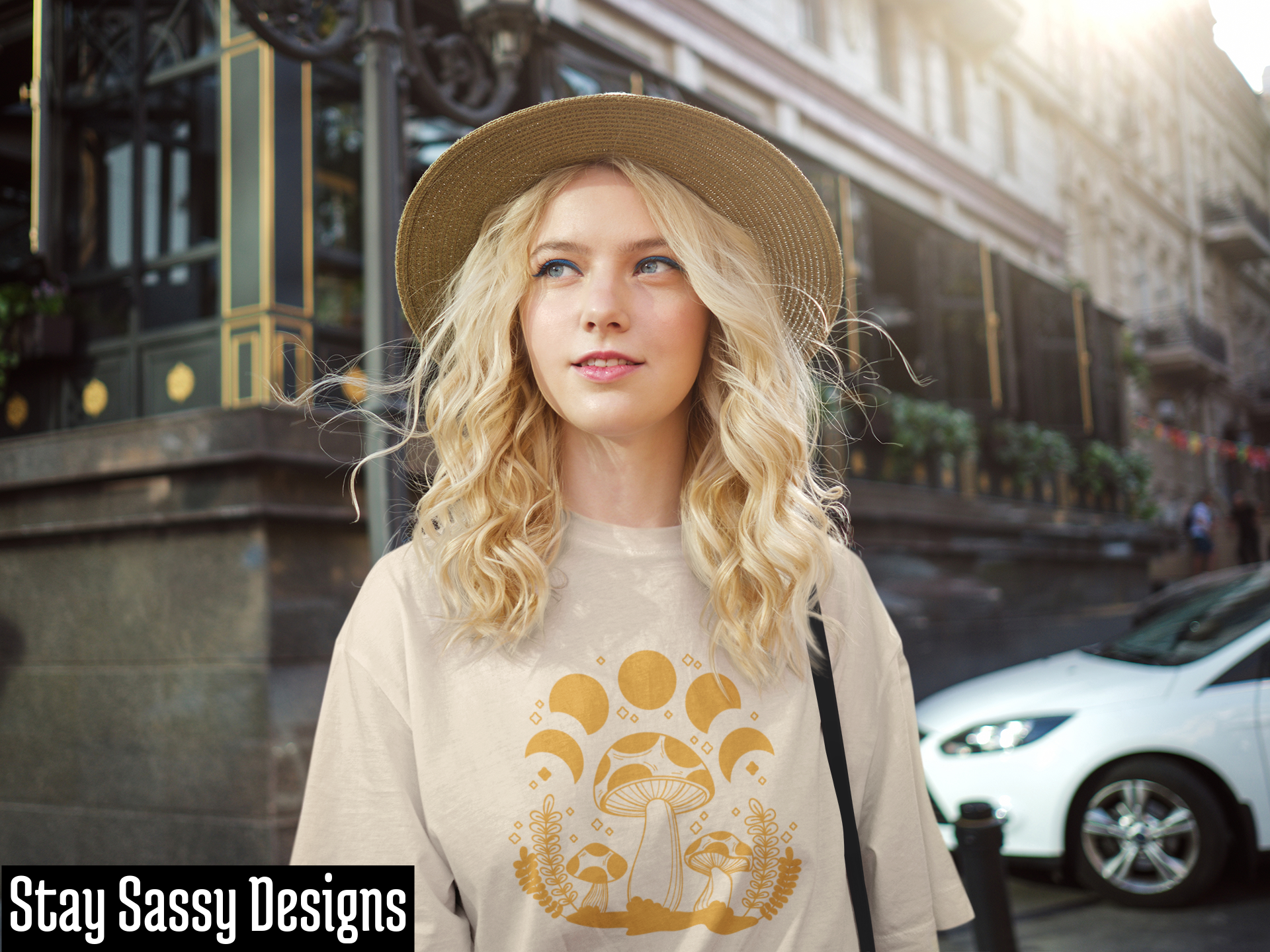 Dare to bring out your inner lunar power with our Moon & Mushroom tee! Available in a trio of colors--Black, White, and Sand--we've carefully crafted this tee to be as stylish as it is comfy. Not sure which one to pick? We say go ahead and get all three, daydreamers! For a fun, earthly look, the Moon & Mushroom Tee. ~ With its stylish fit and funky mushrooms, you'll be sure to stand out!