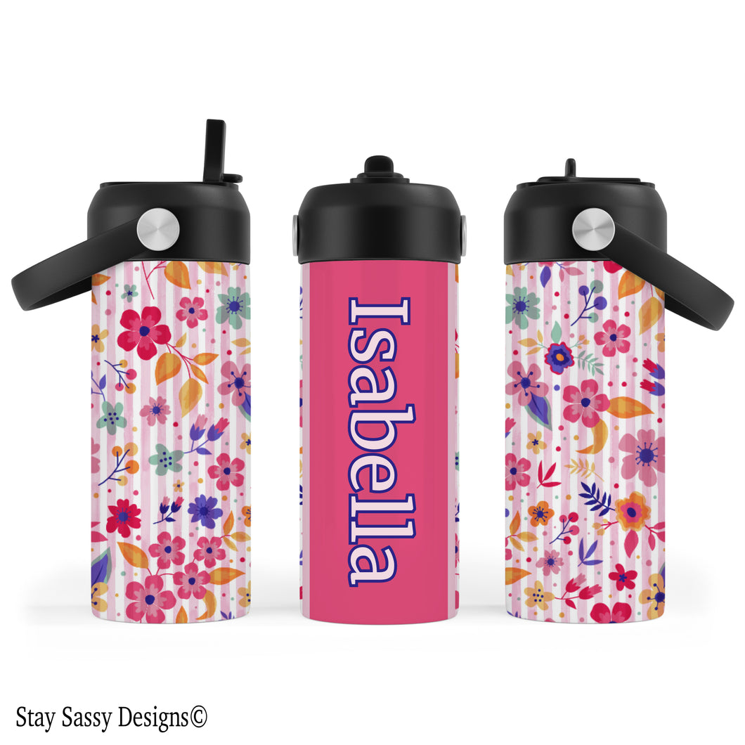 Personalized Pink Striped Floral Water Bottle